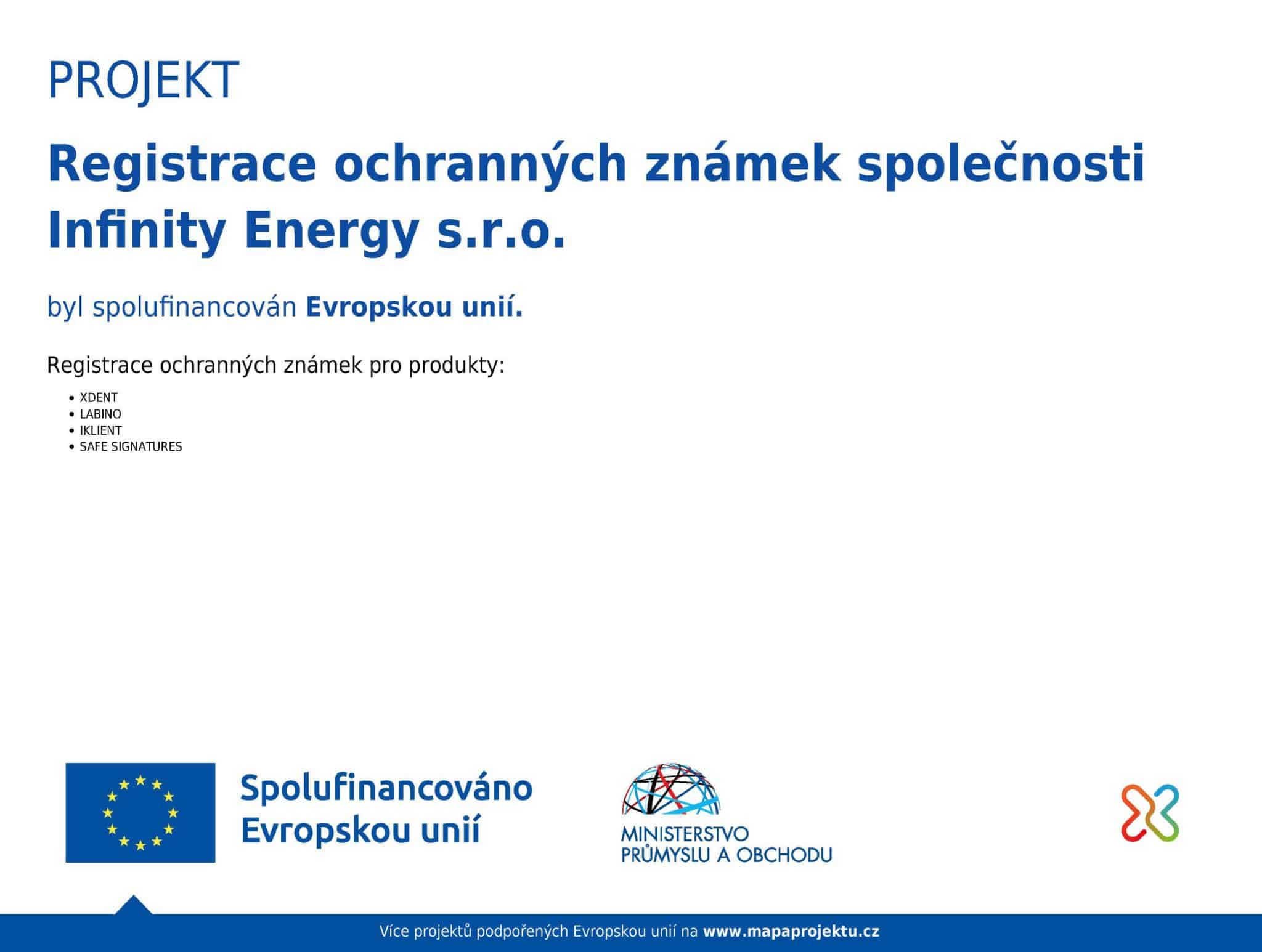 Celý projekt registrácie ochranných známok spoločnosti Infinity energy s.r.o. je spolufinancovaný Európskou úniou